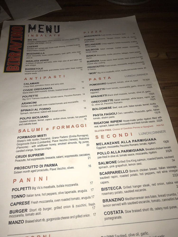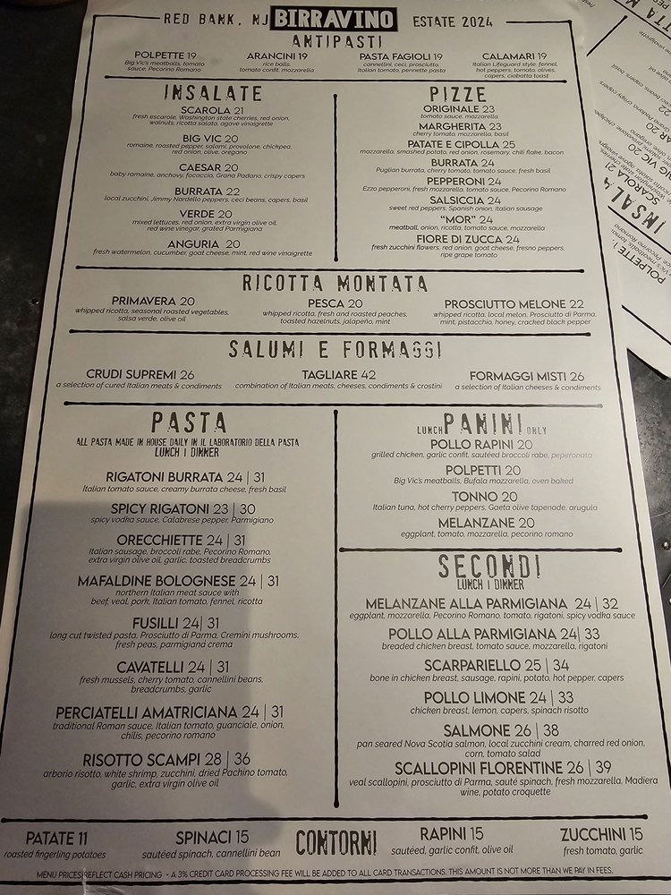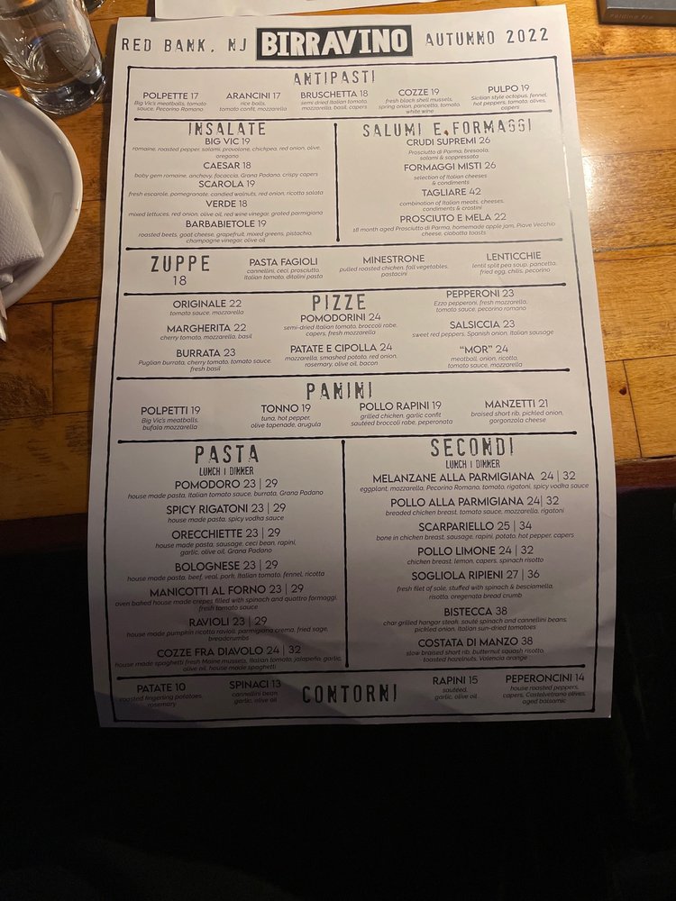 Introducing the menu at Birravino in Red Bank, NJ. This Italian wine bar offers a diverse range of options, including vegan choices. With indoor and outdoor seating, wheelchair accessibility, and a full bar, Birravino is perfect for groups, families, and even date nights. The atmosphere is lively and welcoming, making it an ideal spot for any occasion. Customers rave about the attentive service and flavorful dishes, such as the lemon chicken and spinach risotto, pan-seared salmon, eggplant parmigiana, and tiramisu. Cocktails like the Aqua Jalapeno and Birravino spritz are strong and refreshing. The prices may be on the higher side, but the quality of food and overall experience make it worth it. Don't miss out on the must-try eggplant parmigiana and signature spicy rigatoni vodka pasta at Birravino.